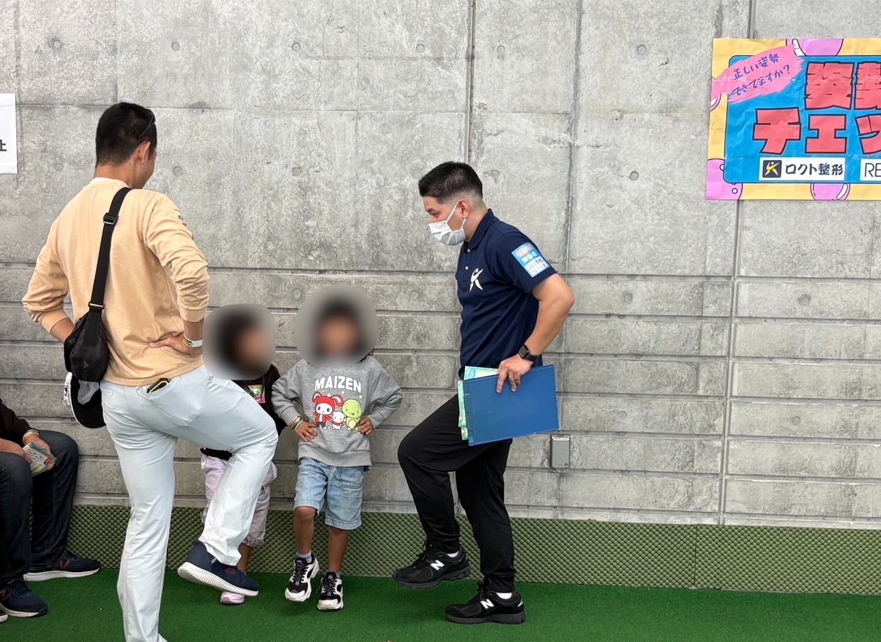 姿勢を確認する動作テスト(壁を利用したアライメントチェック、立位体前屈、開眼片足立ち)を行い、測定結果を踏まえた遊び方(片足立位じゃんけんなど)のレクチャーをさせていただきました!