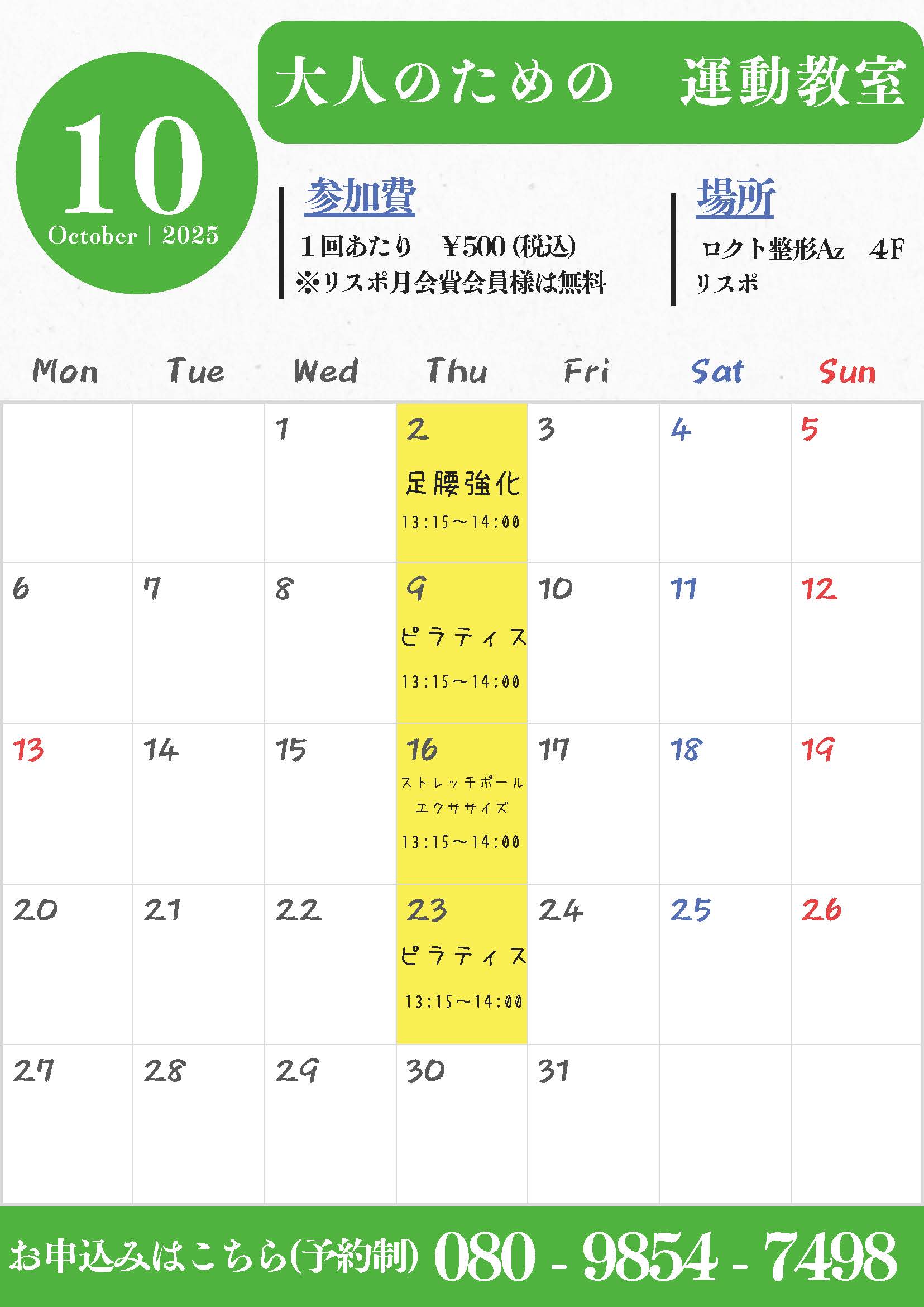 「大人のための運動教室(@那覇)」10月のカレンダー