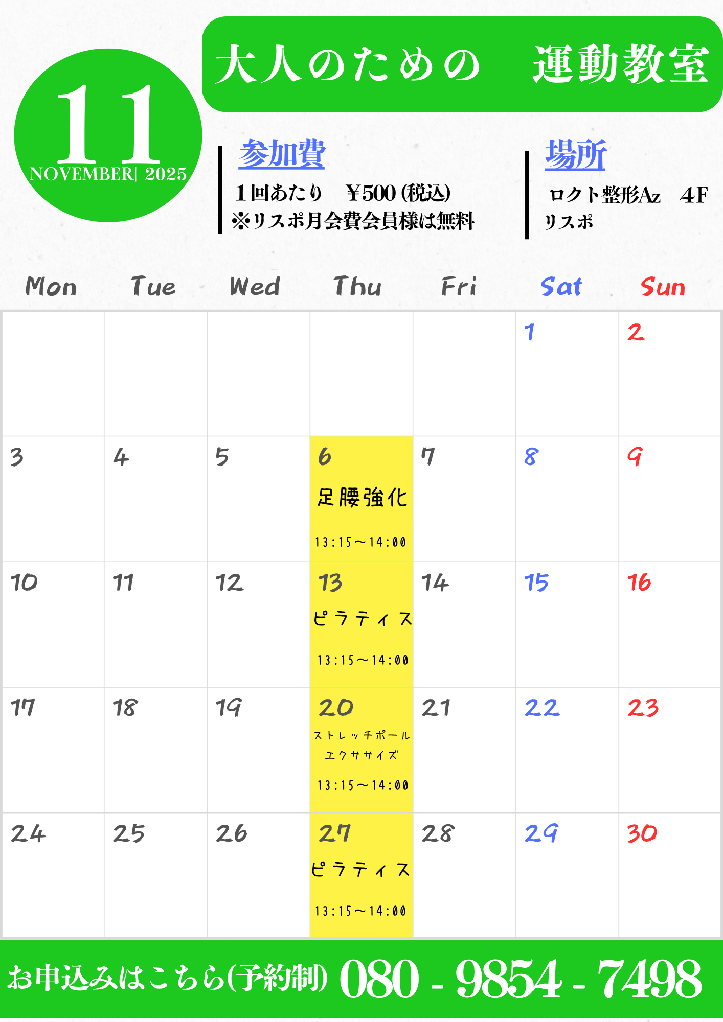 リスポから、ロクト整形Azで週に1回開催している、【大人のための運動教室】のお知らせです!