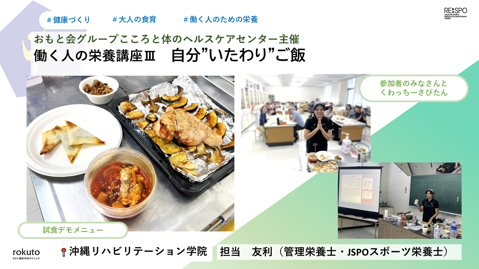 今年度、おもと会グループのヘルスケアセンター主催の健康づくり講演会にて3本立てで教室を企画させていただいております。保健スタッフからは、職員の皆様が、本講習会を通して健康づくりについてもっと手短に!気軽に取り組んでもっと生活を豊かにしてほしい!という思いから初コラボさせていただきました(^^)/