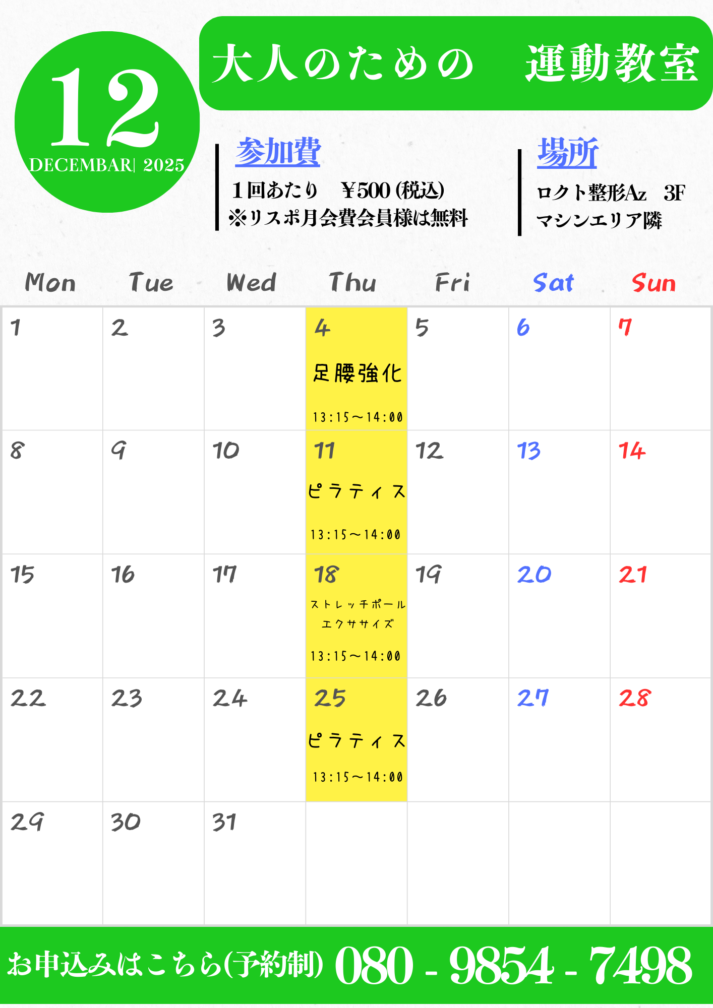 リスポから、ロクト整形Azで週に1回開催している、【大人のための運動教室】のお知らせです!
